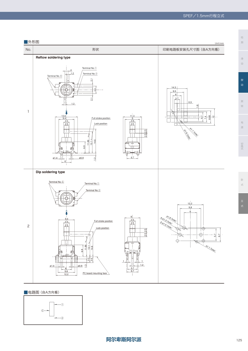 實現無鉛焊接表面貼裝的按動開關。操作方向:Vertical ? 最大額定值:1A 14.5V DC ? 行程:1.5mm ? 電路數:1-pole。