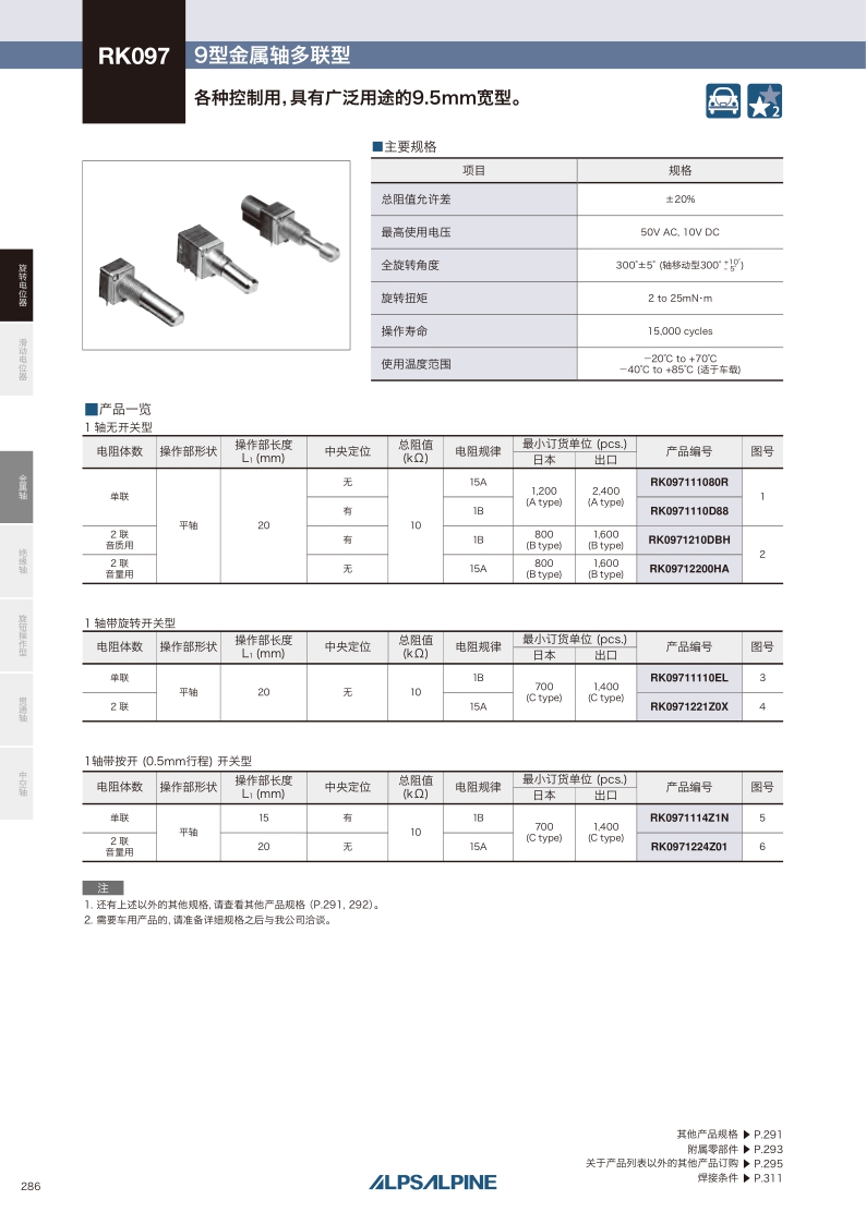 RK097系列適用各種控制用,具有廣泛用途的9.5mm寬型。型:金屬軸多聯 ? 外形尺寸:9型 ? 電阻體數:單聯,2聯 ? 附屬開關:無/旋轉式開關/按開開關/推鎖開關。
