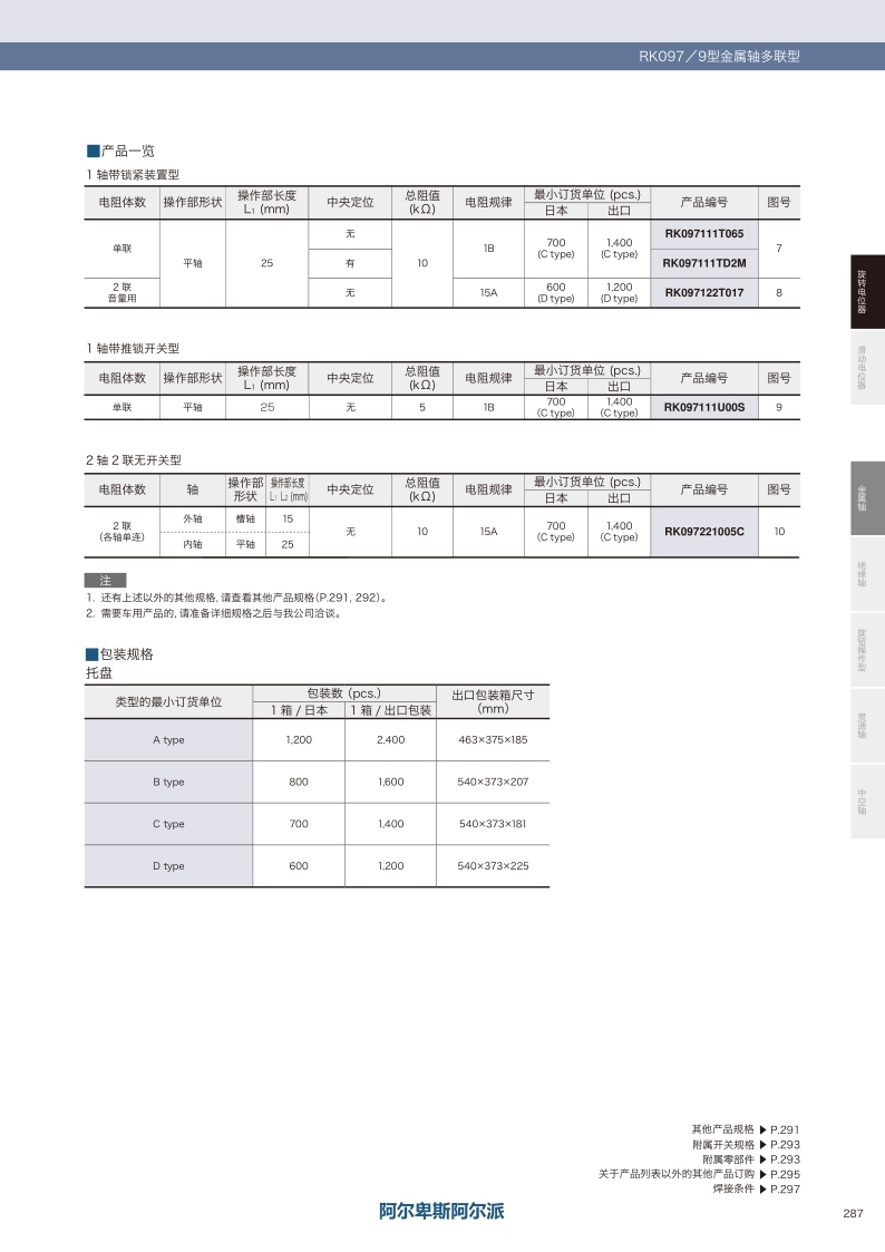 產品編號 照片 操作軸數 電阻體數 操作部方向 軸受固定方法 操作部形狀 操作部長度 定位 總阻值 電阻規律 尺寸