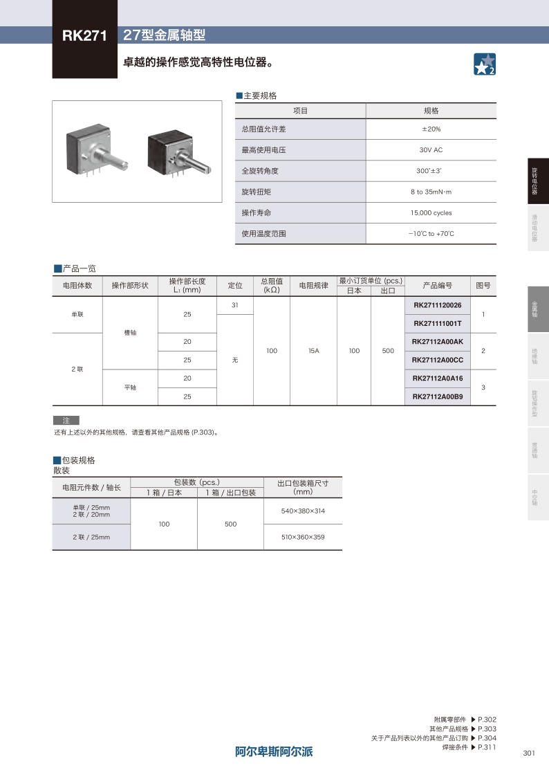 RK271系列卓越的操作感覺高特性電位器。型:金屬軸 ? 外形尺寸:27型 ? 電阻體數:單聯,2聯 ? 附屬開關:無。