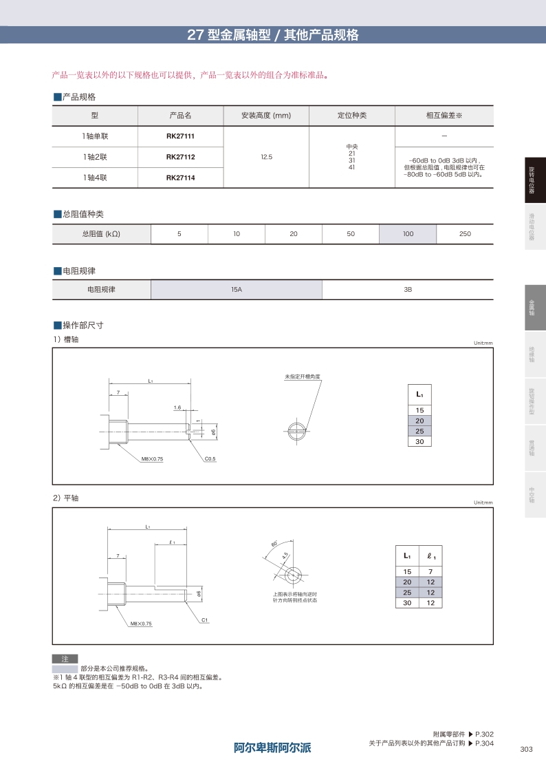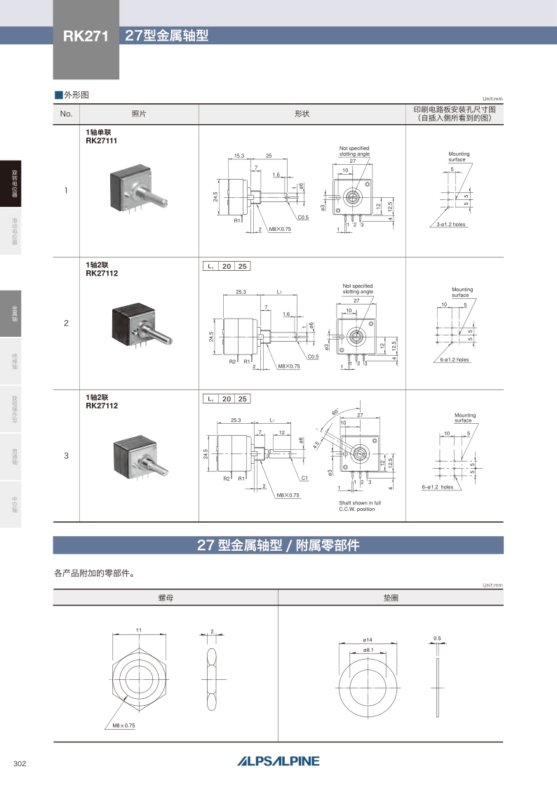 產品編號 照片 操作軸數 電阻體數 操作部方向 軸受固定方法 操作部形狀 操作部長度 定位 總阻值 電阻規律 尺寸