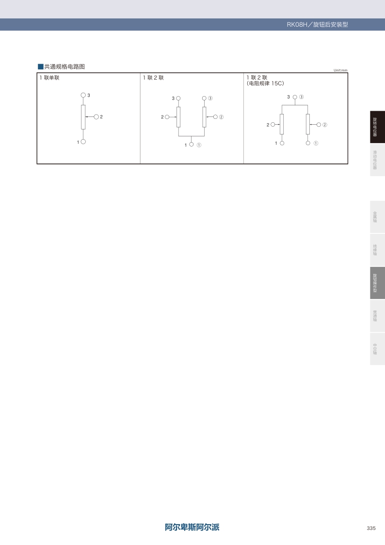 RK08H系列適合于調整音質,音量的小型狀型。型:旋鈕后安裝 ? 外形尺寸:8型 ? 電阻體數:單聯,2聯 ? 附屬開關:無。