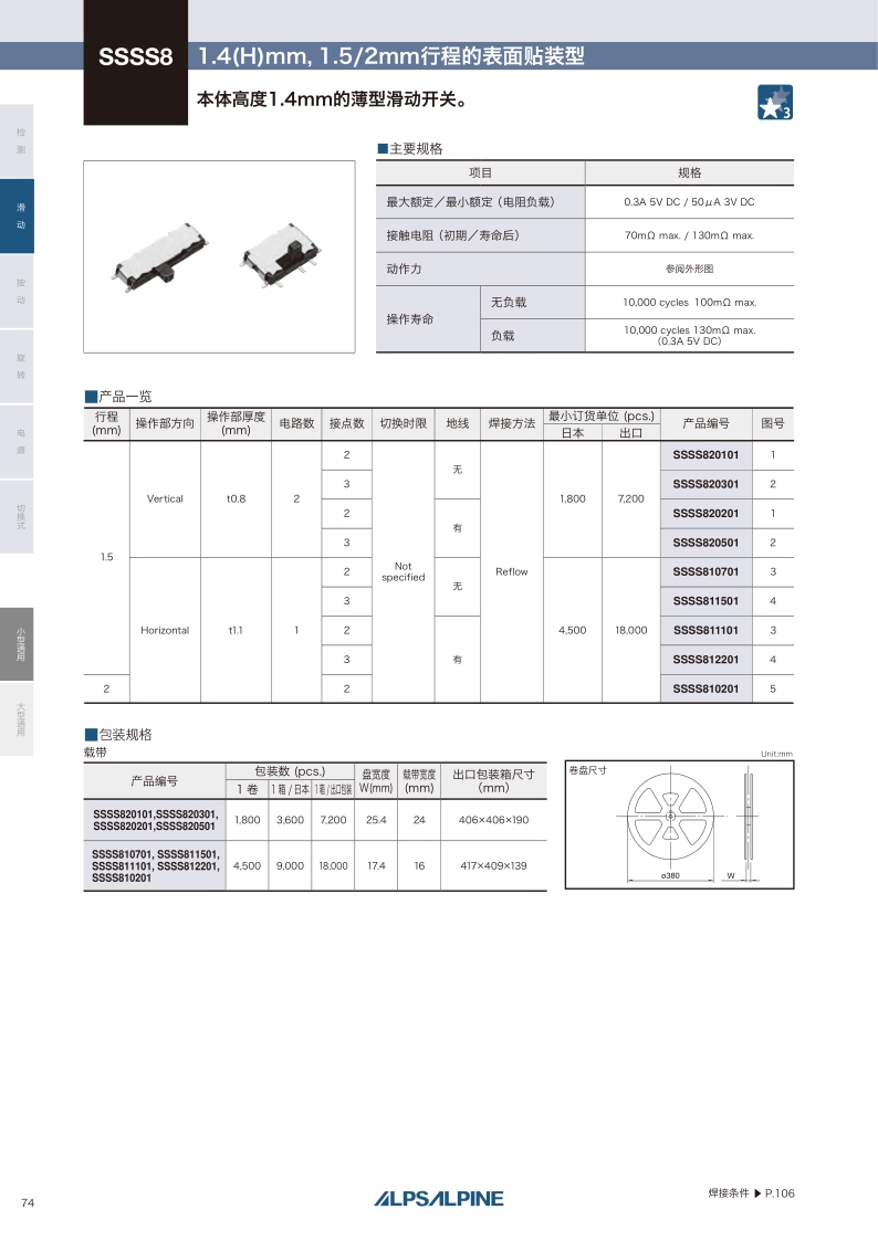 本體高度1.4mm的薄型滑動開關,操作方向:Vertical Horizontal ? 安裝高度:1.4mm ? 行程:1.5/2.0mm ? 最大額定值:0.3A 5V DC ? 電路數:1/2-poles。