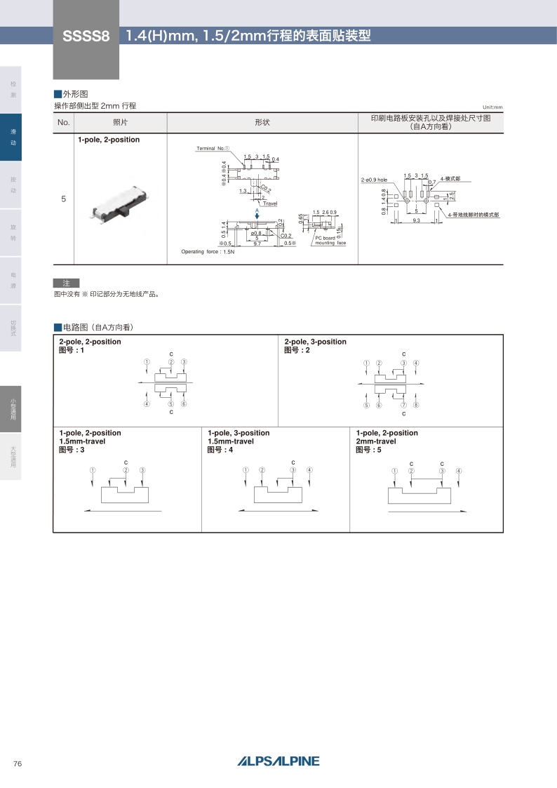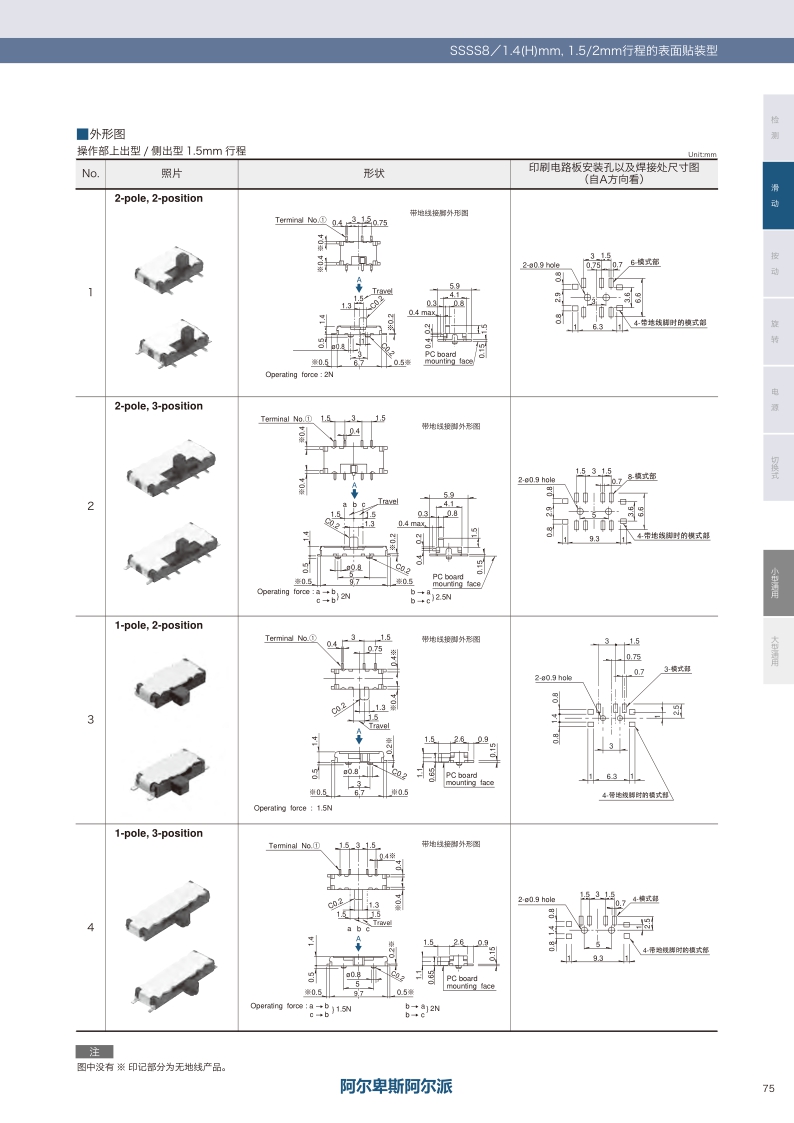 產品編號 照片 行程 操作部方向 操作部厚度 電路數 接點數 動作力 切換時限 接地端子 焊接方法 尺寸(W×D×H)