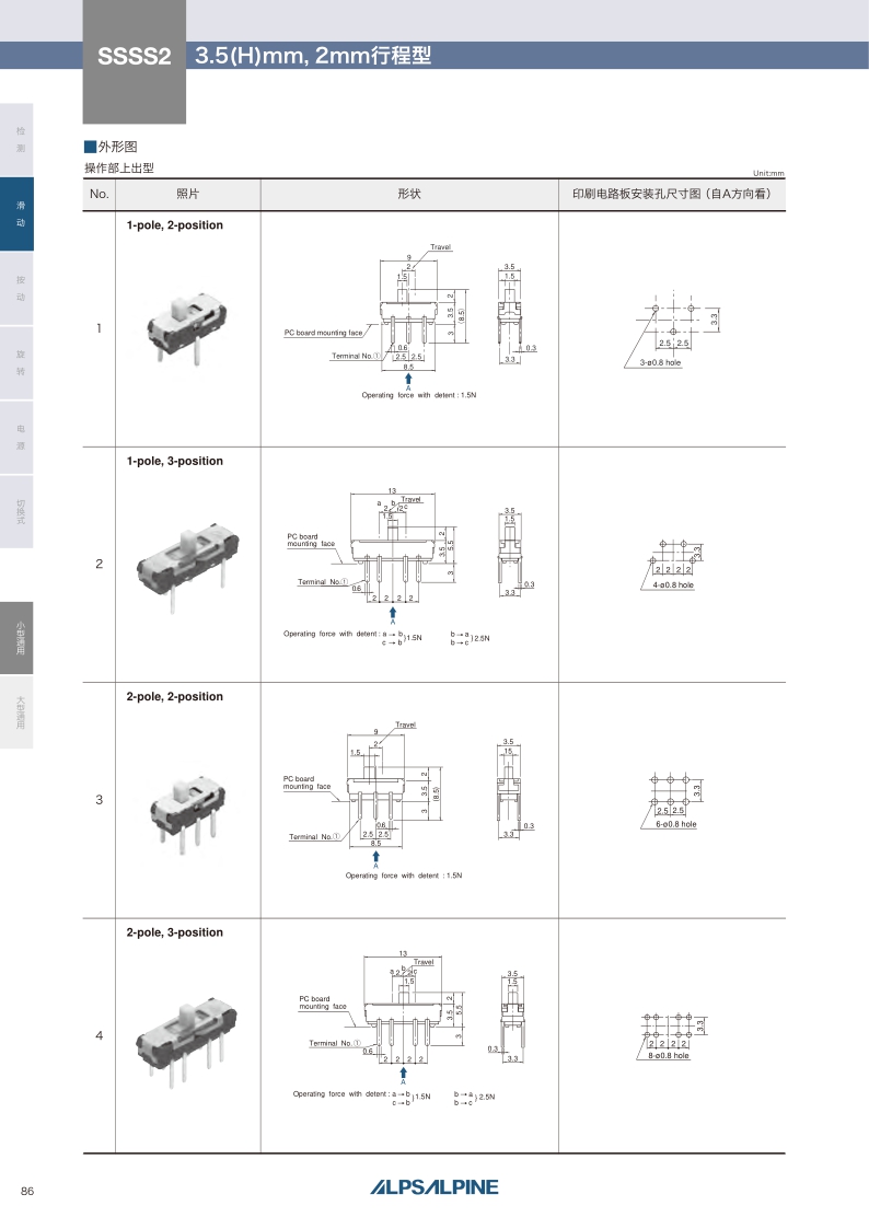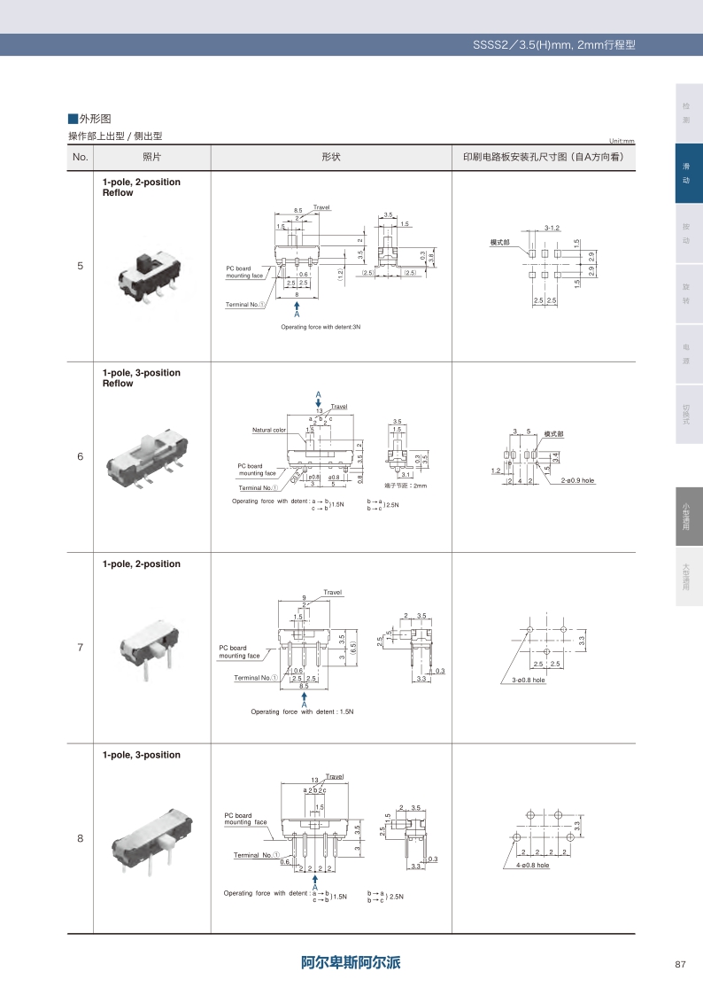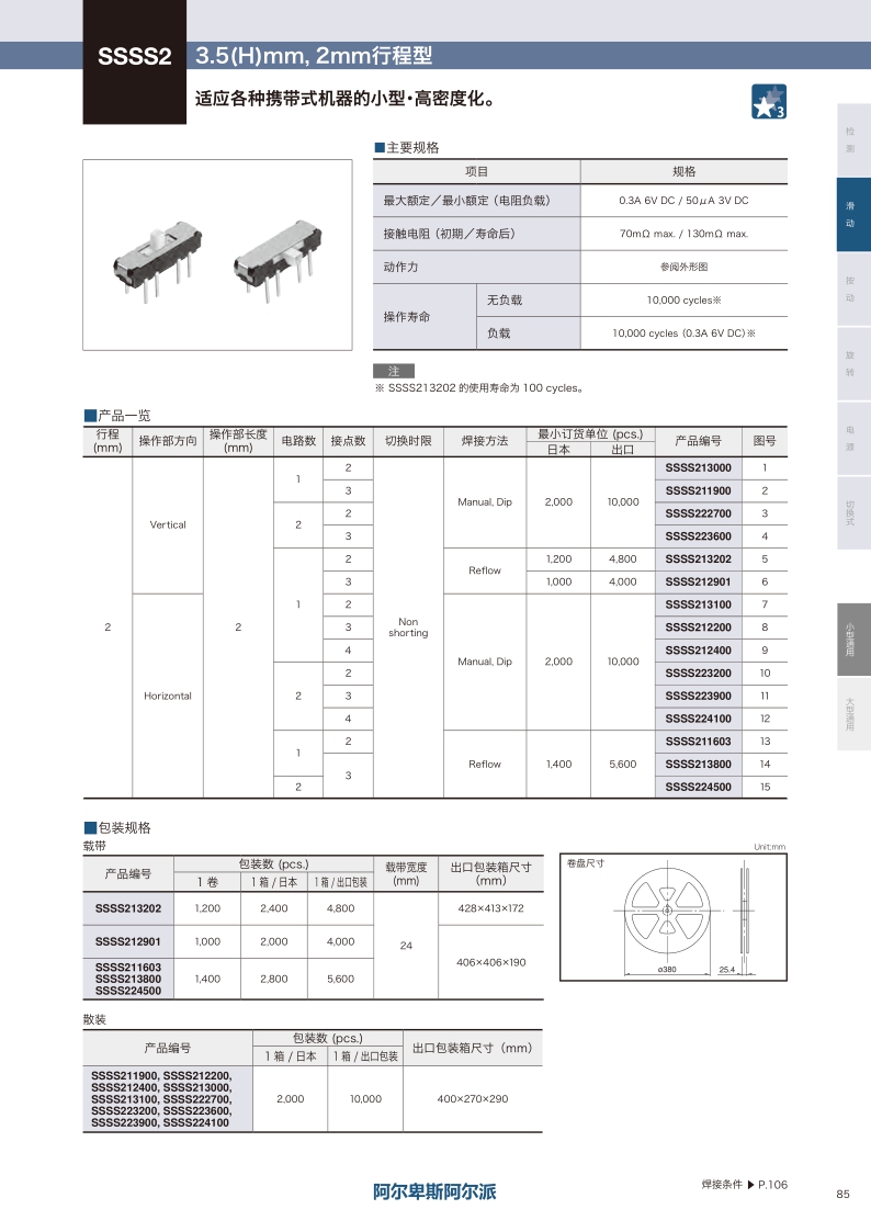 適應各種攜帶式機器的小型·高密度化。操作方向:Vertical Horizontal ? 安裝高度:3.5mm ? 行程:2.0mm ? 最大額定值:0.3A 6V DC ? 電路數:1/2-poles。