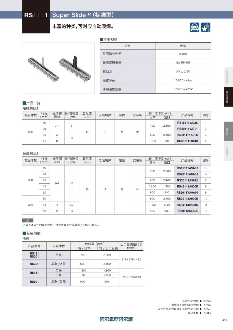 RS451系列可對應自動浸焊。標準 ? 行程:15/20/30/45/60mm ? 電阻體數:單聯,2聯 ? 操作方向:Vertical。