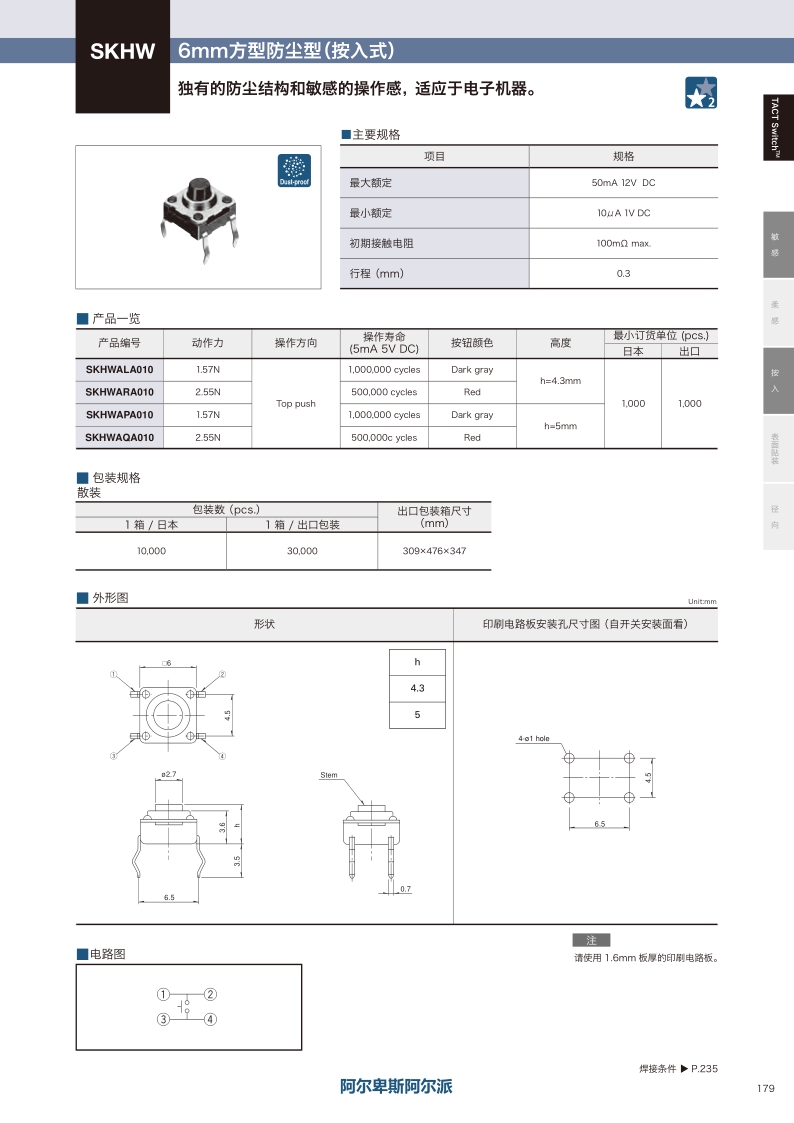 獨有的防塵結構和敏感的操作感 適應于電子機器。操作感覺:敏感 ? 貼裝方式:按入 ? 尺寸(W×D×H):□6.0×4.3/5.0mm ? 特長:防塵型。