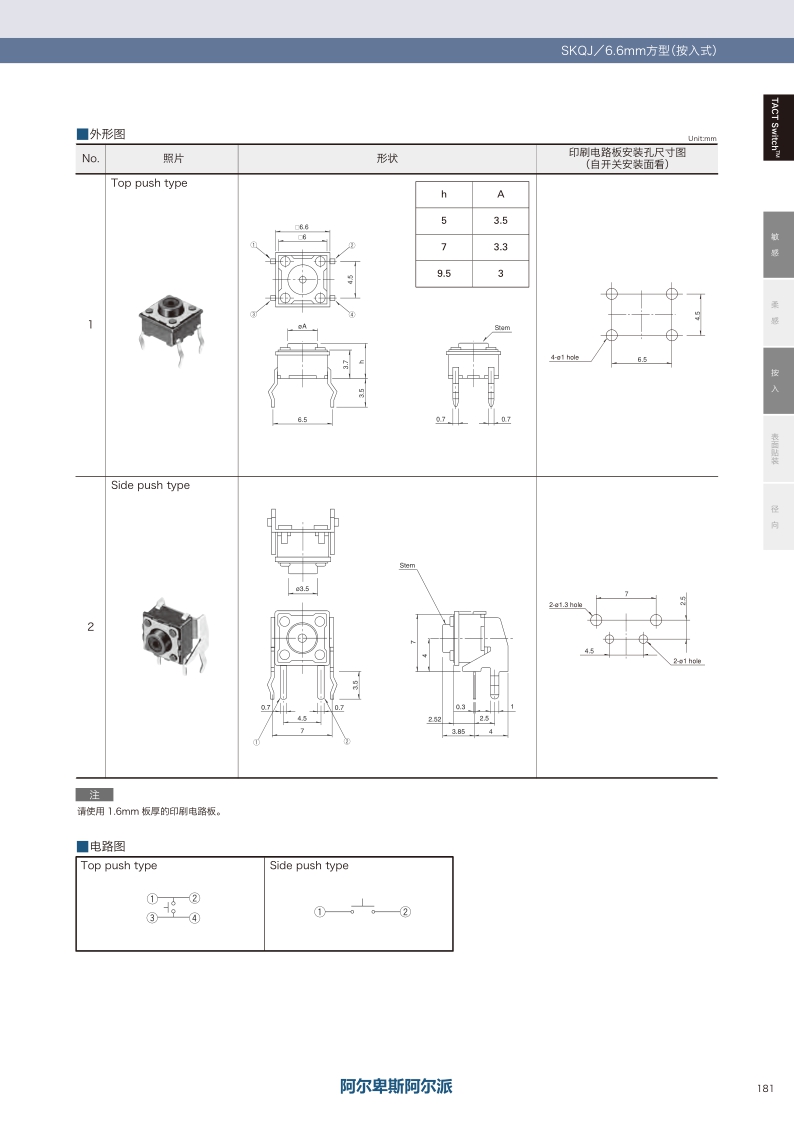 具有敏感的操作觸感 通用性杰出的簡易防塵型。操作感覺:敏感 ? 貼裝方式:按入 ? 尺寸(W×D×H):Top push: □6.6×5.0/7.0/9.5mm Side push: 7.5×7.85×7.3mm ? 特長:防塵型。