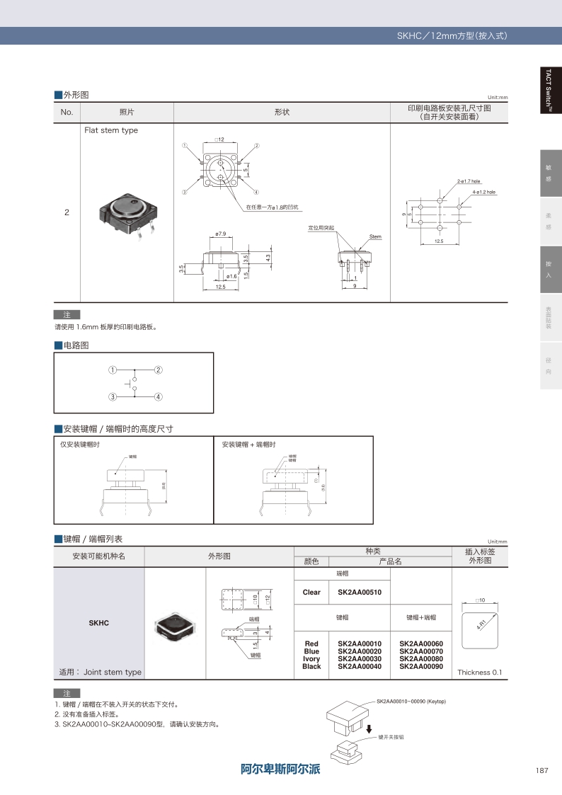 SKHCBFA010 照片 按入 1.27N Top push 0.3mm 1,000,000 cycles 100mΩ max. Black Flat stem 12.0×12.0×4.3mm