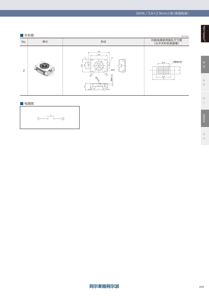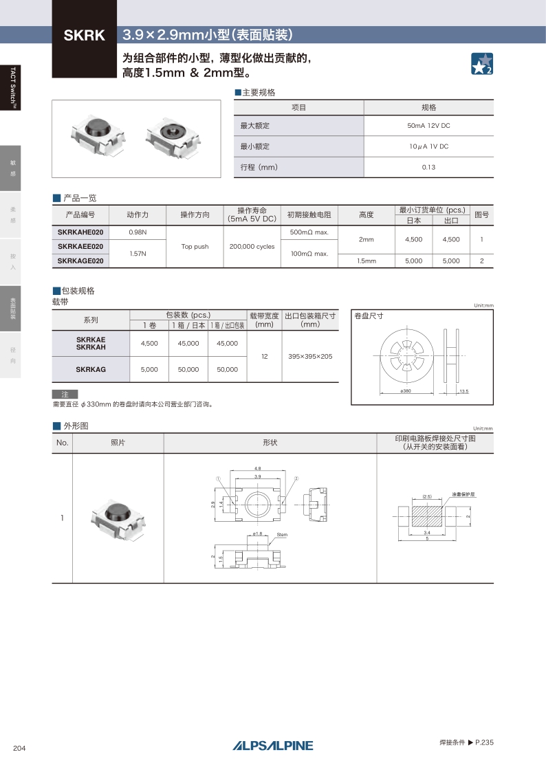 SKRKAGE020 照片 Surface mount 1.57N Top push 0.13mm 1.5mm 200,000 cycles 100mΩ max. 3.9×2.9×1.5