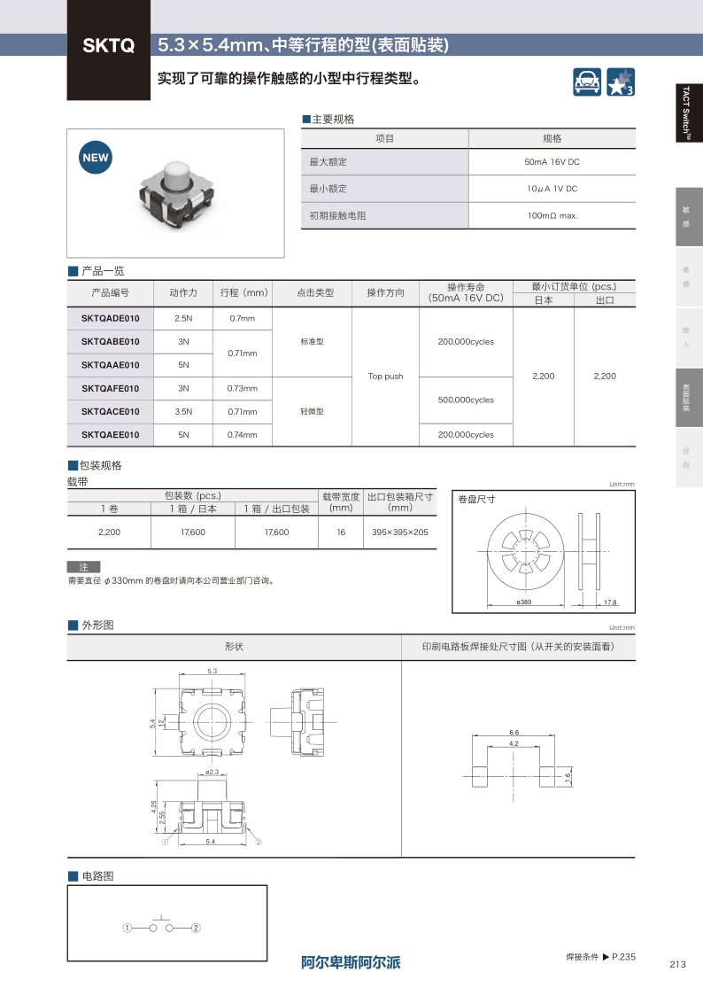 實現了可靠的操作觸感的小型中行程類型。操作感覺:敏感 ? 貼裝方式:表面貼裝 ? 尺寸(W×D×H):5.3×5.4×4.25mm ? 特長:中行程。