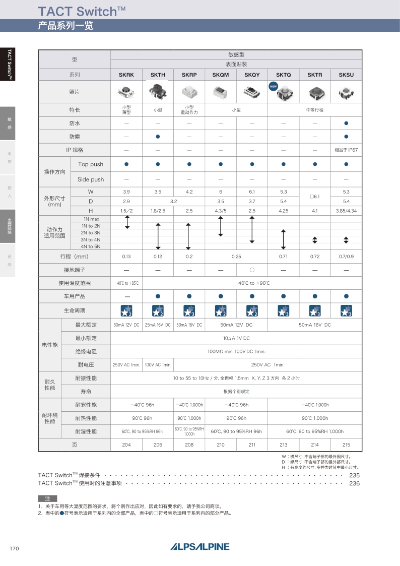 產品編號 照片 動作力 定位型 操作方向 行程 產品高度 操作壽命(50mA 16V DC) 初期接觸電阻 按鈕顏色 尺寸(W×D×H)