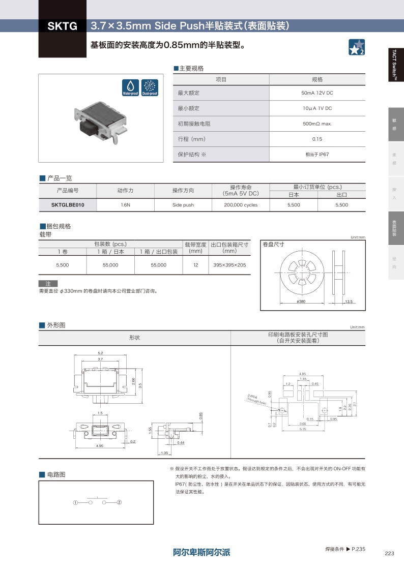 3.7×3.5mm Side Push半貼裝式(表面貼裝) SKTG系列型號 :SKTGLBE010