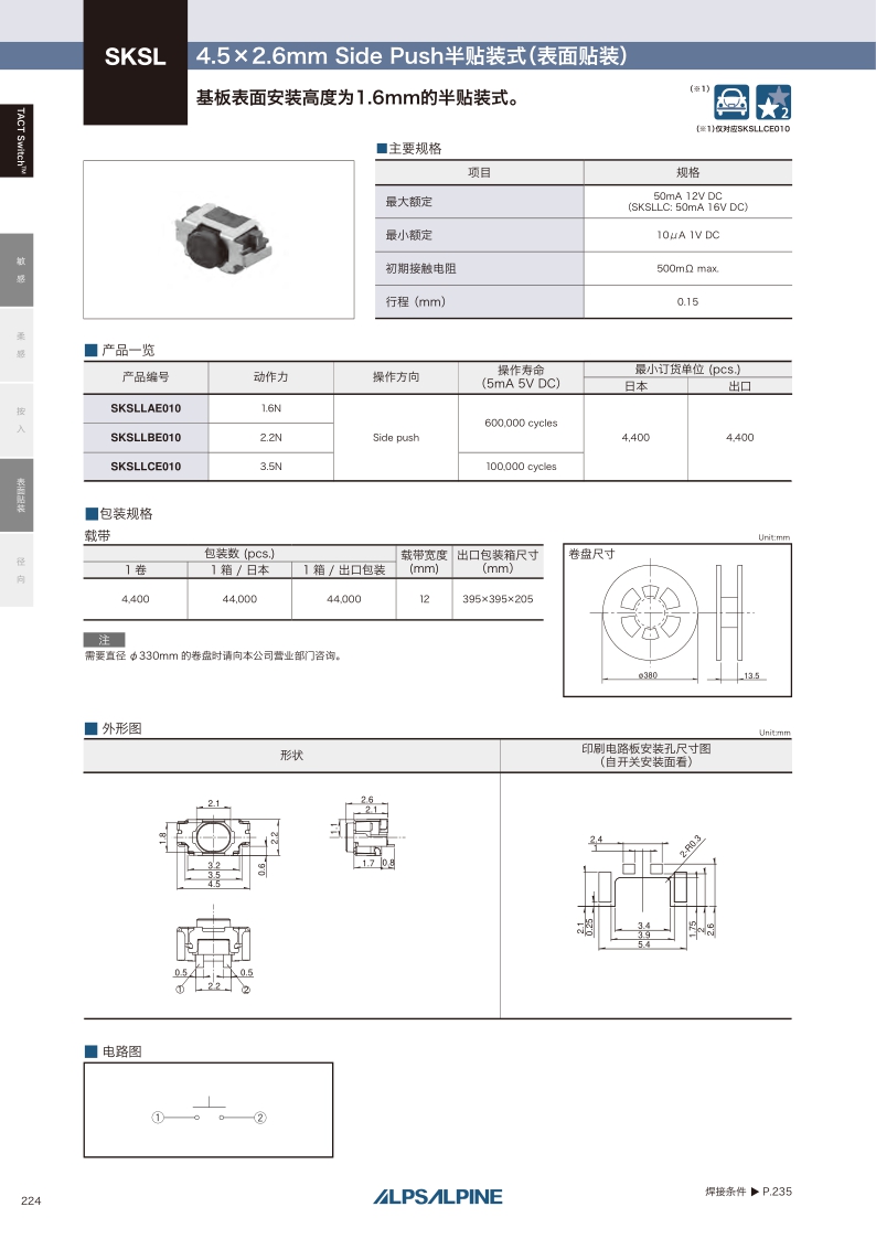 SKSLLCE010 照片 Surface mount 3.5N Side push 0.15mm 2.2mm 100,000 cycles 500mΩ max. 4.5×2.6×2.2